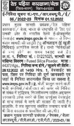 Principal Chief Materials Manager Rail Wheel Factory/Bella invites online (e-open) tenders for stores material from Indian Railway e-Procurement website www.ireps.gov.in for and on behalf of the President of India. Sr. No. 1. Tender No.01221025, Brief Description of Material Fused Silica Powder, Quantity 44373Kgs., Tender Closing / Opening Date : 28.122022 at 14:00 Hrs.