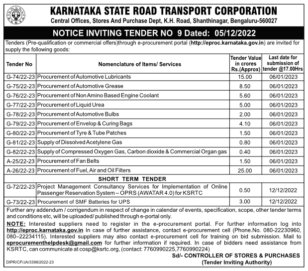 Procurement of SMF Batteries for UPS in KARNATAKA STATE ROAD TRANSPORT CORPORATION