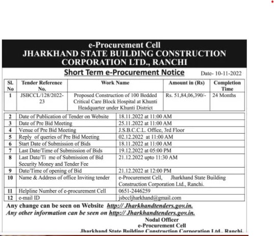 Proposed Construction of 100 Bedded Critical Care Block Hospital at Khunti Headquarters under Khunti District