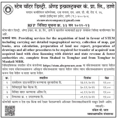 | Stem Water Dist. And Infra Co. Prof. Ltd., Thane is inviting tender on RFP basis for the following
