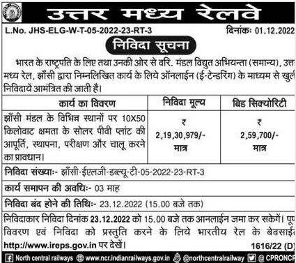 Tender Number:- Jhansi ELG – W- T-05-2022-23-RT-3