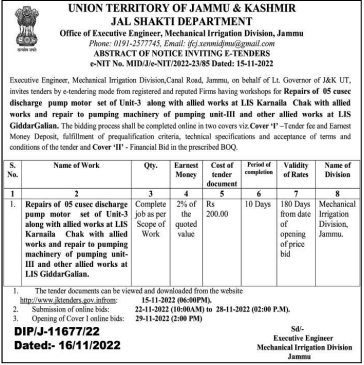 Repairs of 05 cusec discharge pump motor set of Unit-3 along with allied works at LIS works and repair to pumping machinery of pumping unit- III and other allied works at LIS GiddarGalian.