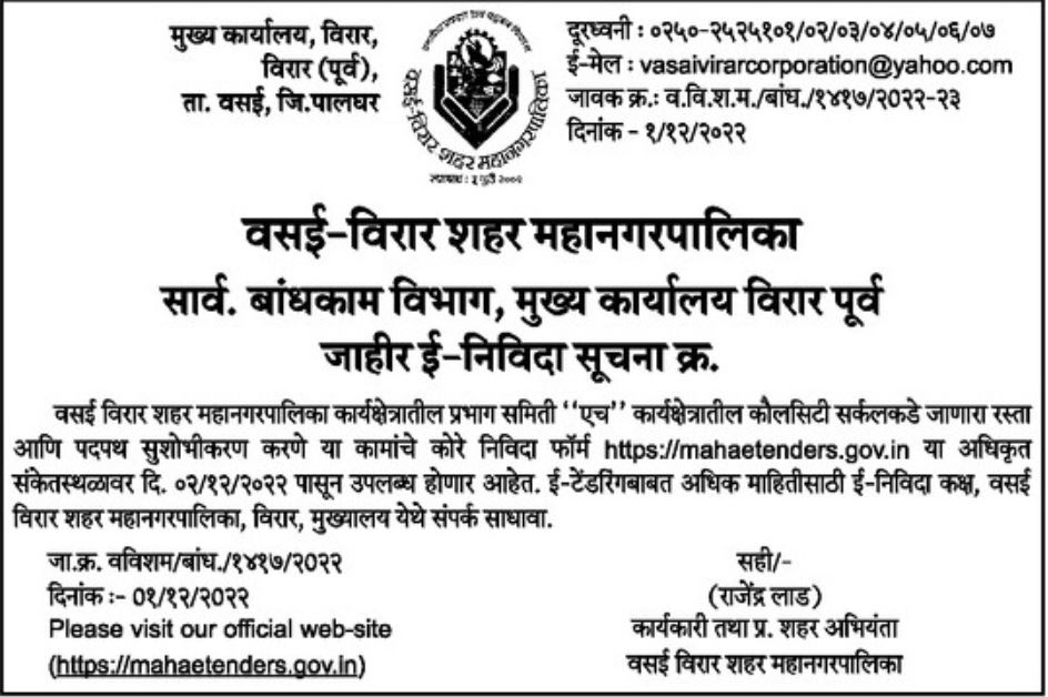 On the website Available from 02/12/2022. For more information on e-tendering e-tender room, Vasai