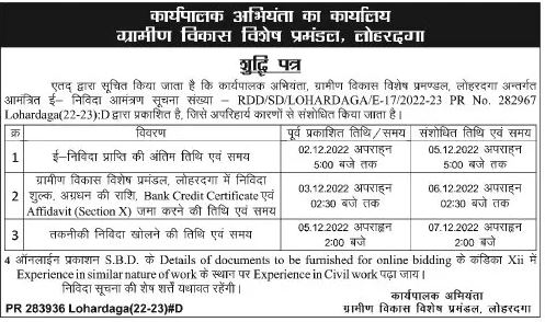 It is hereby informed that under the Executive Engineer, Rural Development Special Division, Lohardaga,