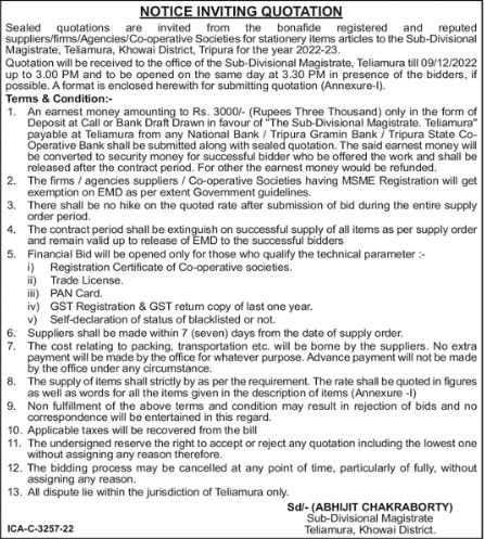 Quotation will be received to the office of the Sub-Divisional Magistrate, Teliamura till 09/12/2022