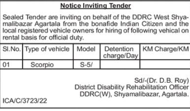 Sealed Tender are inviting on behalf of the DDRC West Shya- malibazar Agartala from the bonafide Indian Citizen and the local registered vehicle owners