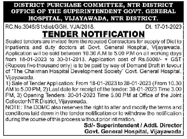 Sealed tenders are invited from the reputed Contractors for supply of Diet to inpatients and duty doctors at Govt. General Hospital, Vijayawada.