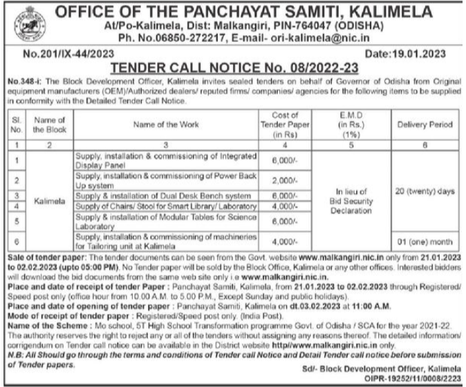 Supply of Chairs/ Stool for Smart Library/Laboratory and Supply & installation of Modular Tables for Science, Supply, installation & commissioning of machineries for Tailoring unit at Kalimela