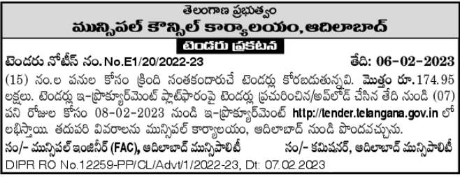 Teder for the undersigned for works nos. Tenders are available on e-procurement http://tender.telangana.gov.in from 08-02-2023 for (07) working days from the date of publication/upload of tenders on e-procurement platform. Further details can be obtained from Municipal Office, Adilabad.