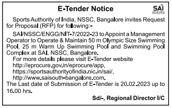 Tender Appoint a Management Operator to Operate & Maintain 50 m Olympic Size Swimming Pool, 25 m Warm Up Swimming Pool and Swimming Pool Complex at SAI, NSSC, Bangalore.