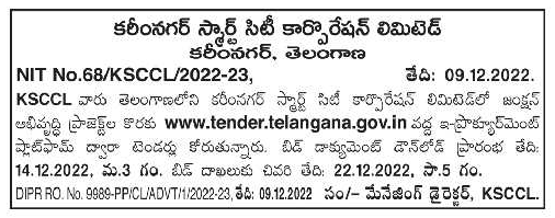 Tender are KSCCL for Karimnagar Smart City Corporation Limited Junction Development Project in Telangana.
