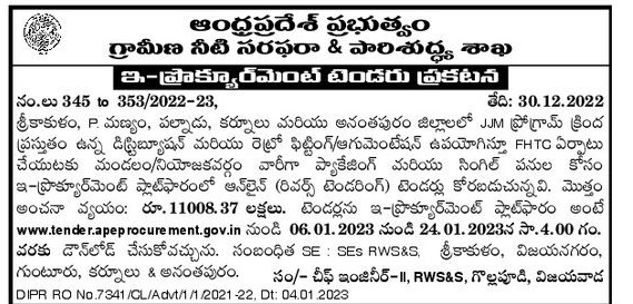 Online (reverse tendering) tenders are invited on e-procurement platform for mandal/constituency wise packaging and single works for setting up FHTC using existing distribution and retro fitting/augmentation under JJM program in Srikakulam, P. Manyam, Palnadu, Kurnool and Anantapur districts.