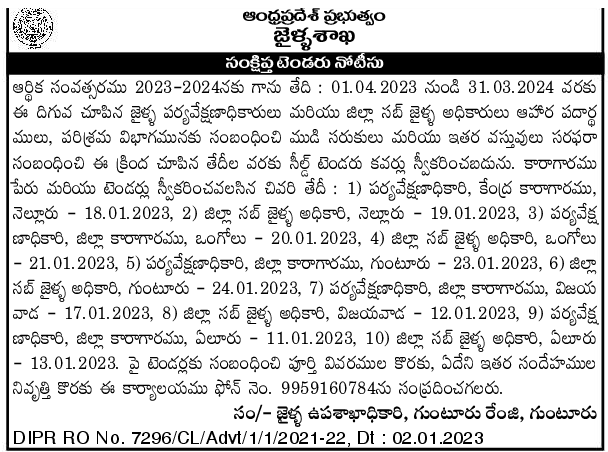 tender covers for the supply of foodstuff, raw materials and other items related to the industrial sector by the Superintendents of Jails and District Sub Jails