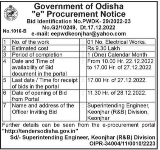 Tender for 01 No. Electrical Works Superintending Engineer, Keonjhar (R&B) Division