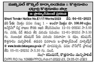 Tender for 01 work in Municipal Council Office :: Kothagudem Bhadradri Kothagudem District.