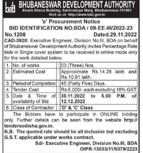 Tender for 03 (Three) Nos. BHUBANESWAR DEVELOPMENT AUTHORITY