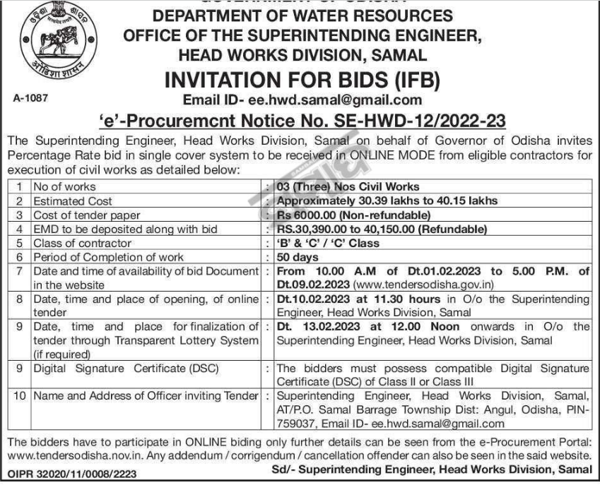 03 (Three) Nos Civil Works DEPARTMENT OF WATER RESOURCES OFFICE OF THE SUPERINTENDING ENGINEER, HEAD WORKS DIVISION, SAMAL