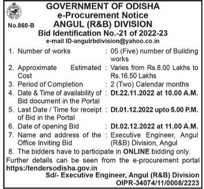 Tender for 05 (Five) number of Building works Sd/- Executive Engineer, Angul (R&B) Division OIPR-34074/11/0008/2223