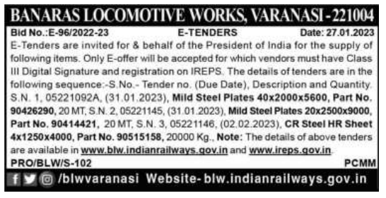 E-Tenders are invited for & behalf of the President of India for the supply of following items. Only E-offer will be accepted for which vendors must have Class III Digital Signature and registration on IREPS. The details of tenders are in the following sequence:-S.No.- Tender no. (Due Date), Description and Quantity S.N. 1, 05221092A, (31.01.2023), Mild Steel Plates 40x2000x5600, Part No. 90426290, 20 MT, SN. 2, 05221145, (31.01.2023), Mild Steel Plates 20x2500x9000, Part No. 90414421, 20 MT. S.N. 3, 05221146, (02.02.2023), CR Steel HR Sheet