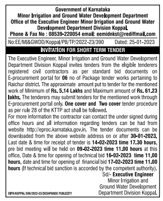 Engineer, Minor Irrigation and Ground Water Development Department Division Koppal invites tenders from the eligible tenderers registered civil contractors as per standard bid documents on E-procurement portal for 06 no of Package tender works pertaining to Raichur district.