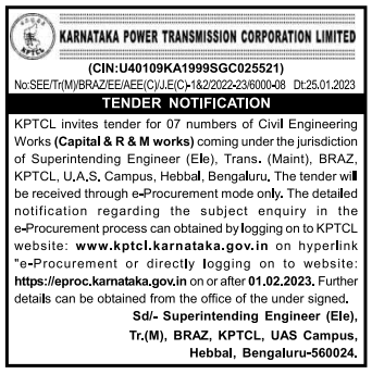 KPTCL invites tender for 07 numbers of Civil Engineering Works (Capital & R & M works) coming under the jurisdiction of Superintending Engineer (Ele), Trans. (Maint), BRAZ, KPTCL, U.A.S. Campus, Hebbal, Bengaluru.