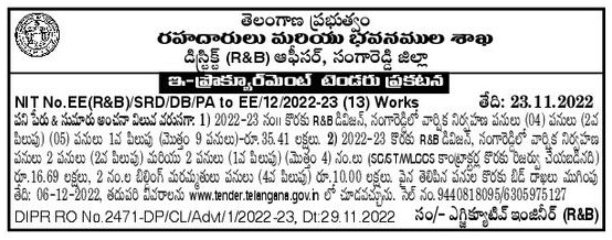 Tender for 1) 2022-23 Annual Maintenance Works for R&B Division, Sangareddy (04) Works (2nd Call) (05) Works 1st Call (Total 9 Works)