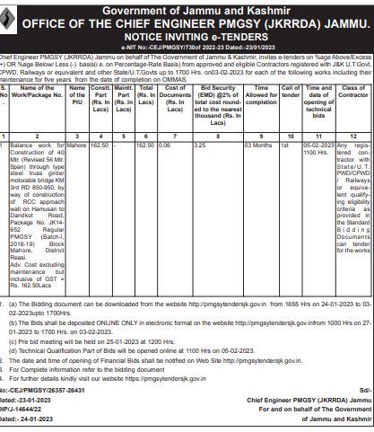 Tender for 1 Balance work Construction of 40 Mtr. (Revised 56 Mt. Span) through type steel truss girder motorable bridge KM 3rd RD 850-960, by way of RCC approach of construction wall on Dandkot Hamusanto Road, Package No. JK14.