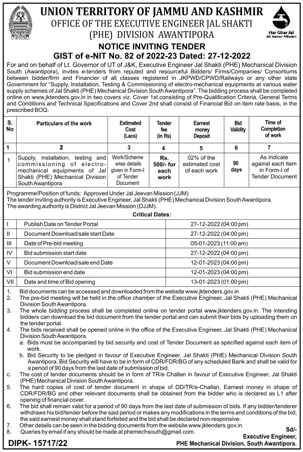 Supply, installation, testing and 1 commissioning of electro- mechanical equipments of Jal Shakti (PHE) Mechanical Division South Awantipora