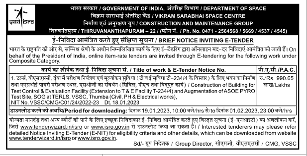Tender for Construction of Building for Test Control & Evaluation Facility (Extension of T&E Facility T-234/4) and Augmentation of ASOE Pyro Test Site, SOG (Civil, PH & Electrical Works) at TERLS, VSSC, Tumba. of building for | Test Control & Evaluation Facility (Extension to T & E Facility T-234/4) and Augmentation of ASOE PYRO Test Site, SOG at TERLS, VSSC, Thumba (Civil, PH & Electrical works),