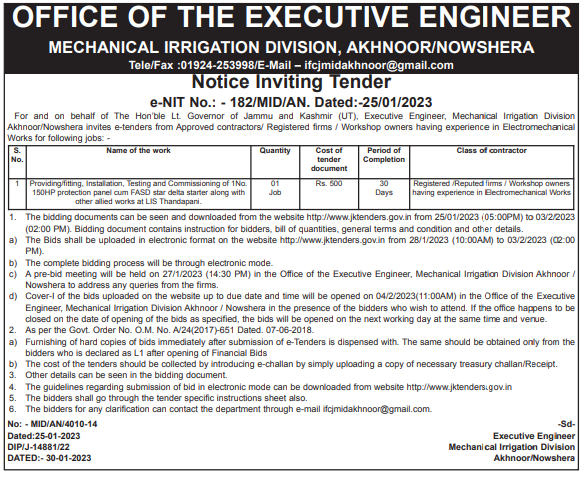 1 Providing/fitting, Installation, Testing and Commissioning of 1No.