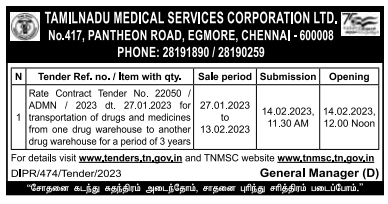 Tender for Rate Contract Tender No. 22050/ ADMN/ 2023 dt. 27.01.2023 for 1 transportation of drugs and medicines from one drug warehouse to another drug warehouse for a period of 3 years