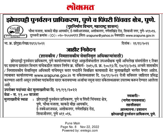 Tender For 1 Vacancy in the Cadre of Deputy Superintendent Land Records in the sanctioned structure of Slum Rehabilitation Authority, Pune Office General Administration Department Government Decision No. Narrow- 2715/Q. No. 100/13 d. 17 / 12 / 2016 will be filled through direct interview from Government / Semi-Government Retired Officers for contract work.