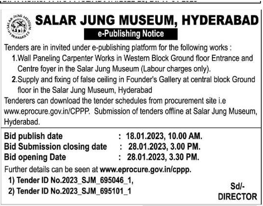 Tender for 1.Wall Paneling Carpenter Works in Western Block Ground floor Entrance and Centre foyer in the Salar Jung Museum (Labour charges only). 2.Supply and fixing of false ceiling in Founder’s Gallery at central block Ground floor in the Salar Jung Museum, Hyderabad