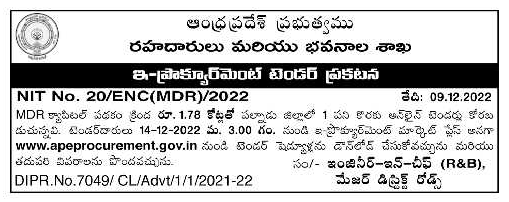 Tender for 1 work in Palnadu District in MDR Capital Scheme.