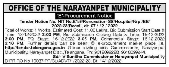 Tender for 1 Works in NARAYANPET MUNICIPALITY