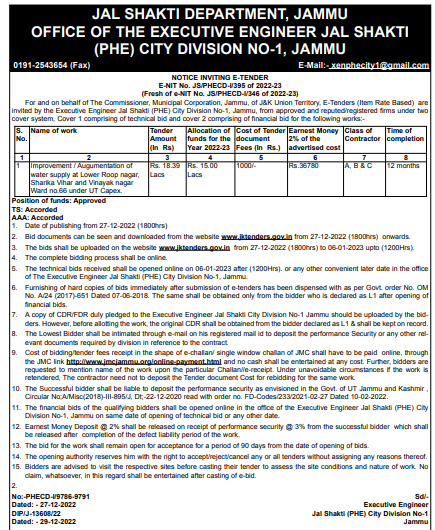 Tender for 11 Improvement/Augumentation of Water supply at Lower Roop Nagar, Sharka Vihar and Vinayak Nagar Ward no.66 under UT Capex.