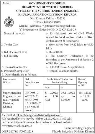 Tender for 13 (thirteen) nos. of Civil Works related to flood control works