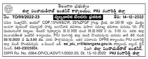 Tender for (13) works, including CDP.15%W&CW, 35% under ZPGF grants, construction of Community Halls Anganwadi Buildings, Mahila Samkhaya Buildings and CC Road etc.