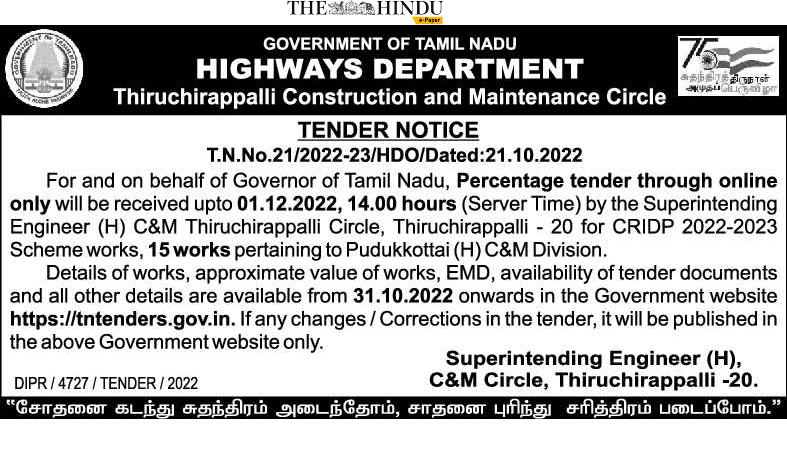 For and on behalf of Governor of Tamil Nadu, Percentage tender through online only will be received upto 01.12.2022, 14.00 hours (Server Time) by the Superintending Engineer (H) C&M Thiruchirappalli Circle, Thiruchirappalli – 20 for CRIDP 2022-2023 Scheme works, 15 works pertaining to Pudukkottai (H) C&M Division.