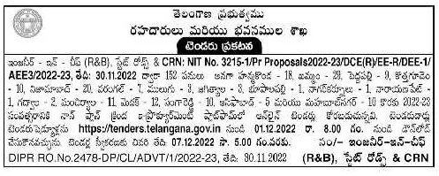 Tender for 152 works are Hanmakonda – 18, Khammam – 28, Peddapalli – 9. Kottagudem – 10, Nizamabad – 20. Warangal – 1, Mulugu – 3, Jagityala – 3, Bhupalapalli – 1. Nagakkarnulu – 1, Narayanapet 1. Gadwala 2. Manchiryala- 11. Medak 12, Sangareddy 10, Asifabad – 5 and Mahbubnagar – 10