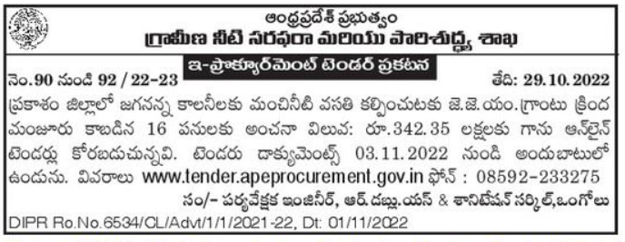 Tender for 16 works sanctioned under JJM grant for provision of fresh water accommodation to Jagananna colonies in Prakasam district
