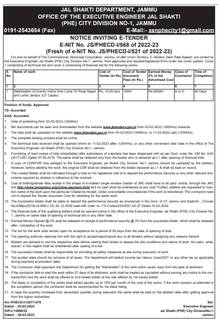Tender for 2 3 4 5 6 7 1 Stabilization of Gravity mains from Lohar To Roop Nagar and Lohar Janipur (UT Capex)