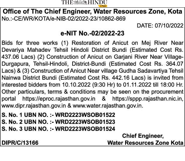 Tender for (2) Construction of Anicut on Garjani River Near Village Durgapura, Tehsil-Hindoli, District-Bundi (Estimated Cost Rs. 364.07 Lacs)