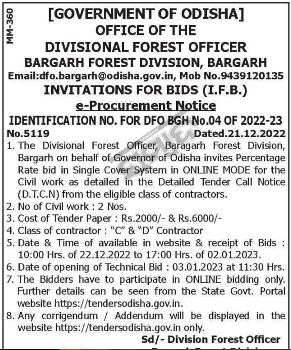 Tender for 2 Nos. OFFICE OF THE DIVISIONAL FOREST OFFICER BARGARH FOREST DIVISION, BARGARH Email:dfo.bargarh@odisha.gov.in, Mob No.9439120135 INVITATIONS FOR BIDS (I.F.B.)