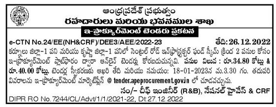 Tender for 2 works under Central Road In Structure Fund Scheme Kurnool District-1 Work and Krishna District-1 Work