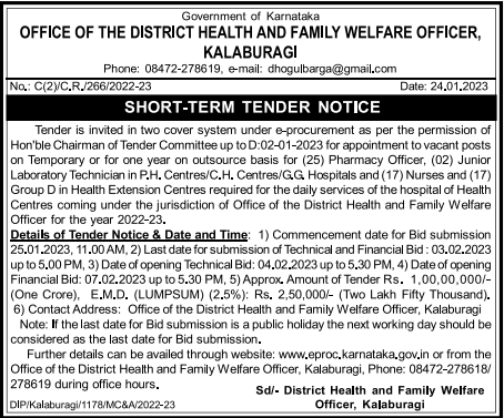 Tender for (25) Pharmacy Officer, (02) Junior Laboratory Technician in P.H. Centres/C.H. Centres/GG Hospitals and (17) Nurses and (17) Group D in Health Extension Centres required for the daily services of the hospital of Health Centres coming under the jurisdiction of Office of the District Health and Family Welfare Officer for the year 2022-23.