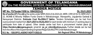 Tender for (27) Recalling the works under MRR 2022-23 & 2023-24, MRR, CRR 2018-19, MRR 2021- 22, MOMB & Minority Welfare Funds Grants in Mahabubnagar, Wanaparthy, Jogulamba Gadwal & Narayanpet Districts.