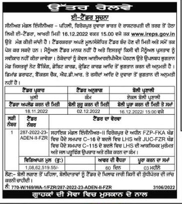 Senior Mandal Engineer – 1st, Ferozepur via the underwritten e-tender on behalf