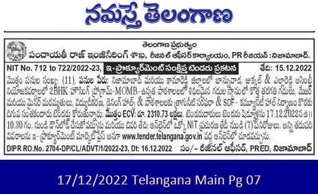 Tender for 2BHK Housing Program in Bansuwada, Jukkal & Ellareddy Assembly Constituencies in Nizamabad and Kamareddy Districts-New classrooms in place of dilapidated buildings in MOMB High Schools. Major and minor repairs, electrification. The undersigned invites tenders for supply of drinking water to dining halls & schools & construction of SDF Community Hall.