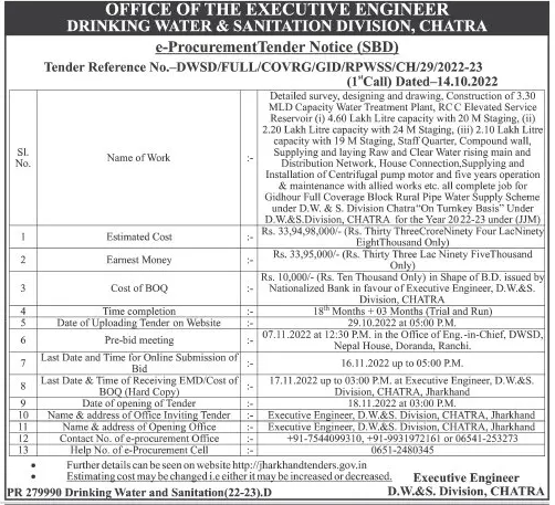 Tender for 4.60 Lakh Liter capacity with 20 M Staging,